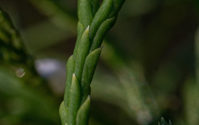 Clubmosses, as well as other plants, are building their own bodies from the air. They are locking in the carbon, which comes through the tiny plant noses - stomata. If you take a closer look you might get lost in myriads of leaves arranged perfectly on their shoots. Why are they repeating themselves? Microphyll by microphyll in this spiral pattern. It’s the ultimate, perfect angle, following the Fibonacci sequence. It reminds of rosary beads in the rough hand of the centenarian. Meditating on the events in the life of Jesus, referred to as the four mysteries. What are the four pillars of your meditation journey, clubmoss? Are you guided by the wind, water, pulse of the earth, and heat of the sun? This helical phyllotaxy starts at the tip of the shoot with a single initial cell, unlike seed plants. It is a perfect ancient performance. A meditative dance, or even a song. Do we know how these cells learn all the moves so perfectly? Is it a bioelectrical map that the cells follow in morphospace (as postulated by Michael Levin) to solve the quest for peace?