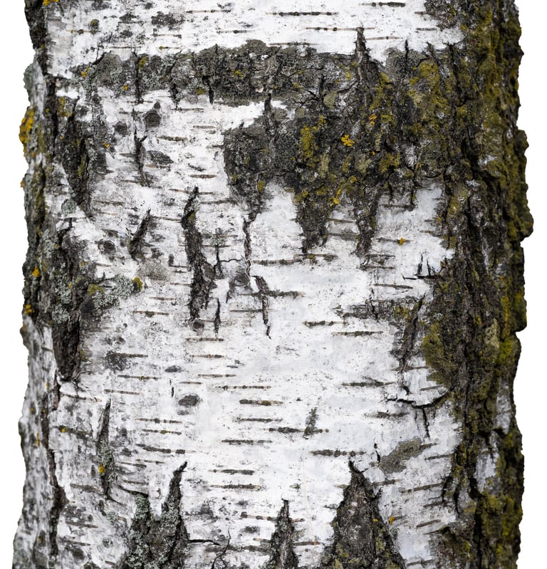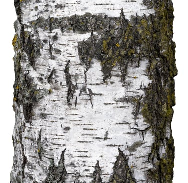 Lichens can grow on any stable surface because they are not reliant on their substrate for nutrients. Since birch (white part) bark peels off too often, lichens don't grow there. Interestingly, the slower a tree grows in its early years, the more lichens it tends to have, as lichens don't thrive on fast-growing surfaces.