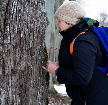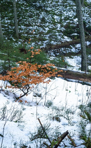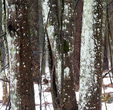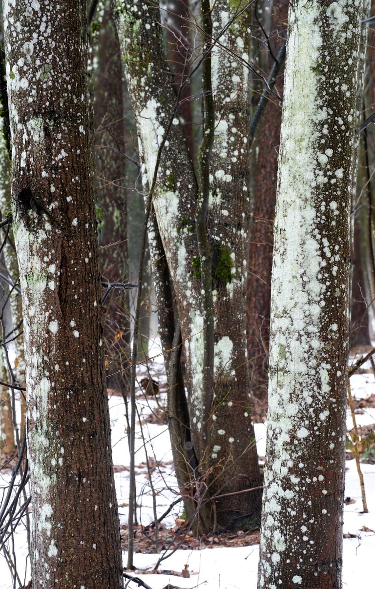 North-oriented slopes or other depressions formed by glaciers have snow and ice cover in February. As we walk around looking for lichens, the forest becomes full of sharp snow crackling. One can also notice the rundown water frozen on the trunk of an old tree. Can the forced extension cause a bark crack? Will the crack become inhabited by some specialized species, looking for the right microhabitat?