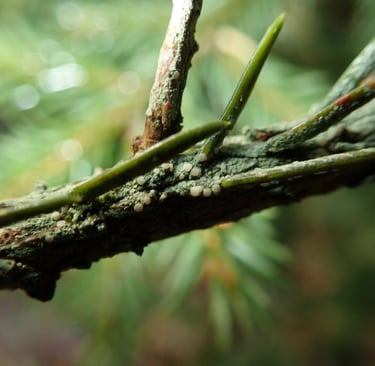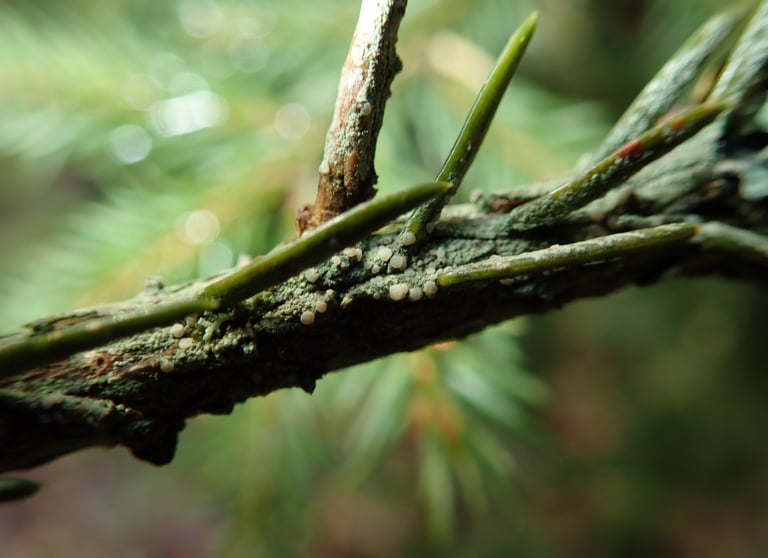 Pale Leaf-Dot, Fellhanera bouteillei, spotted on a spruce needle. Captured by Jurga Motiejūnaitė