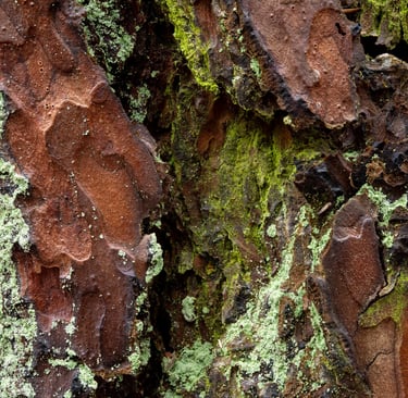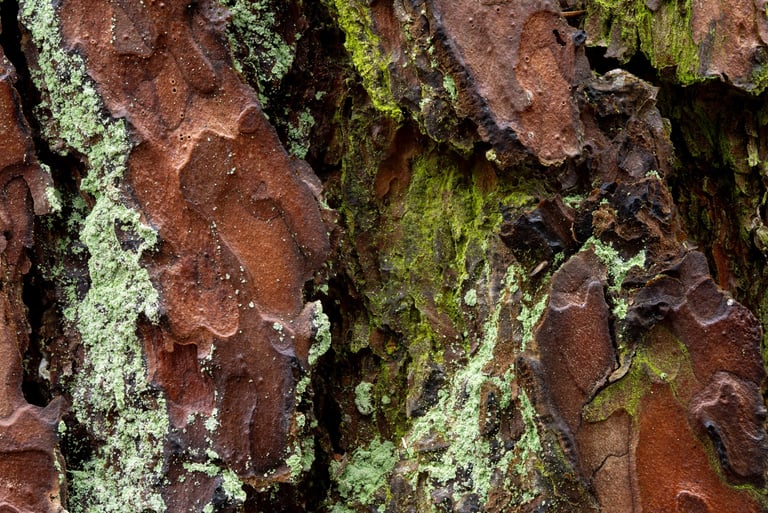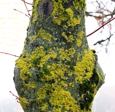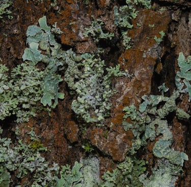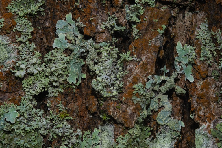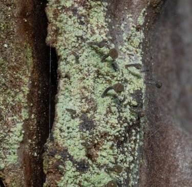 When searching for lichens on tree bark, getting up close with the nose almost touching, you'll likely spot other organisms too. For example, one might encounter orange terrestrial algae (2) or green algae (3)!