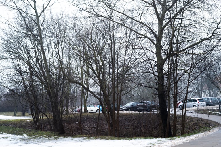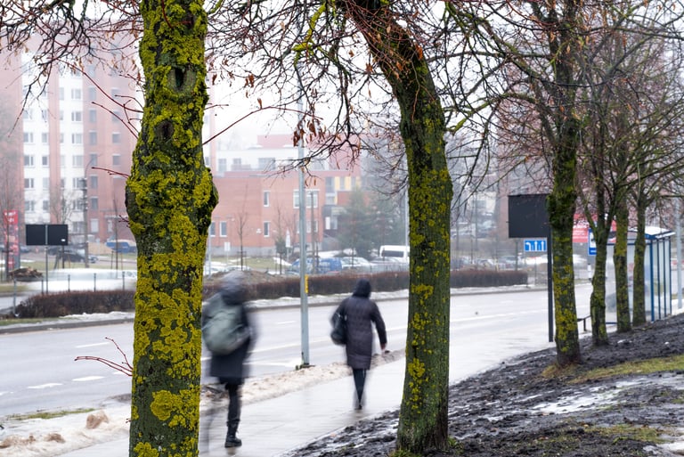 On Vilnius's main street, the lichen community remains similar but with fewer varieties due to increased pollution.