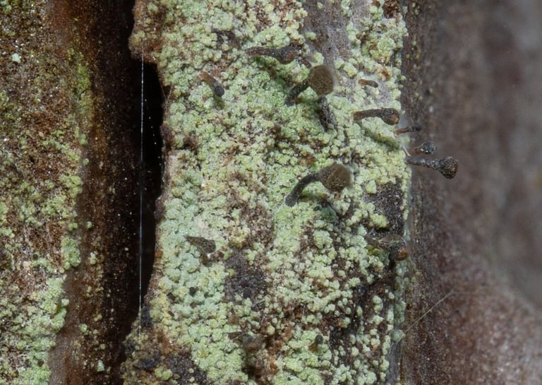 Chaenotheca ferruginea on a pine tree bark, 0.4-2 mm tall