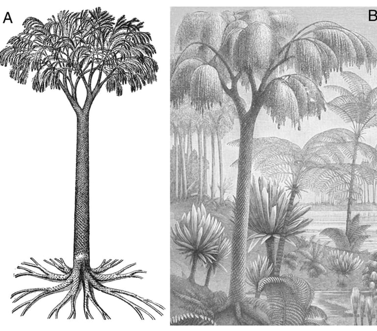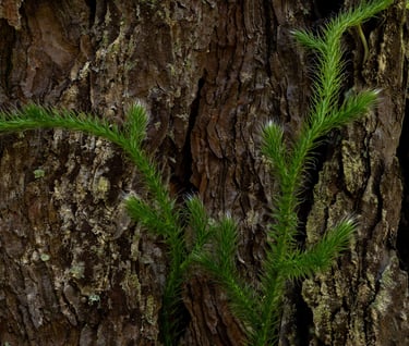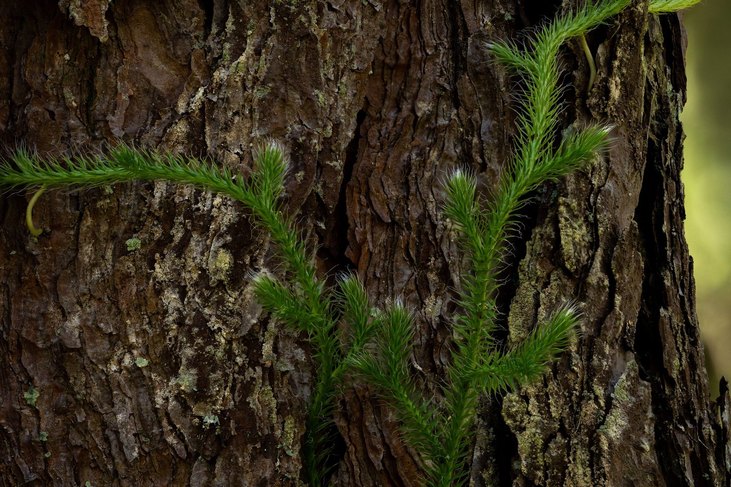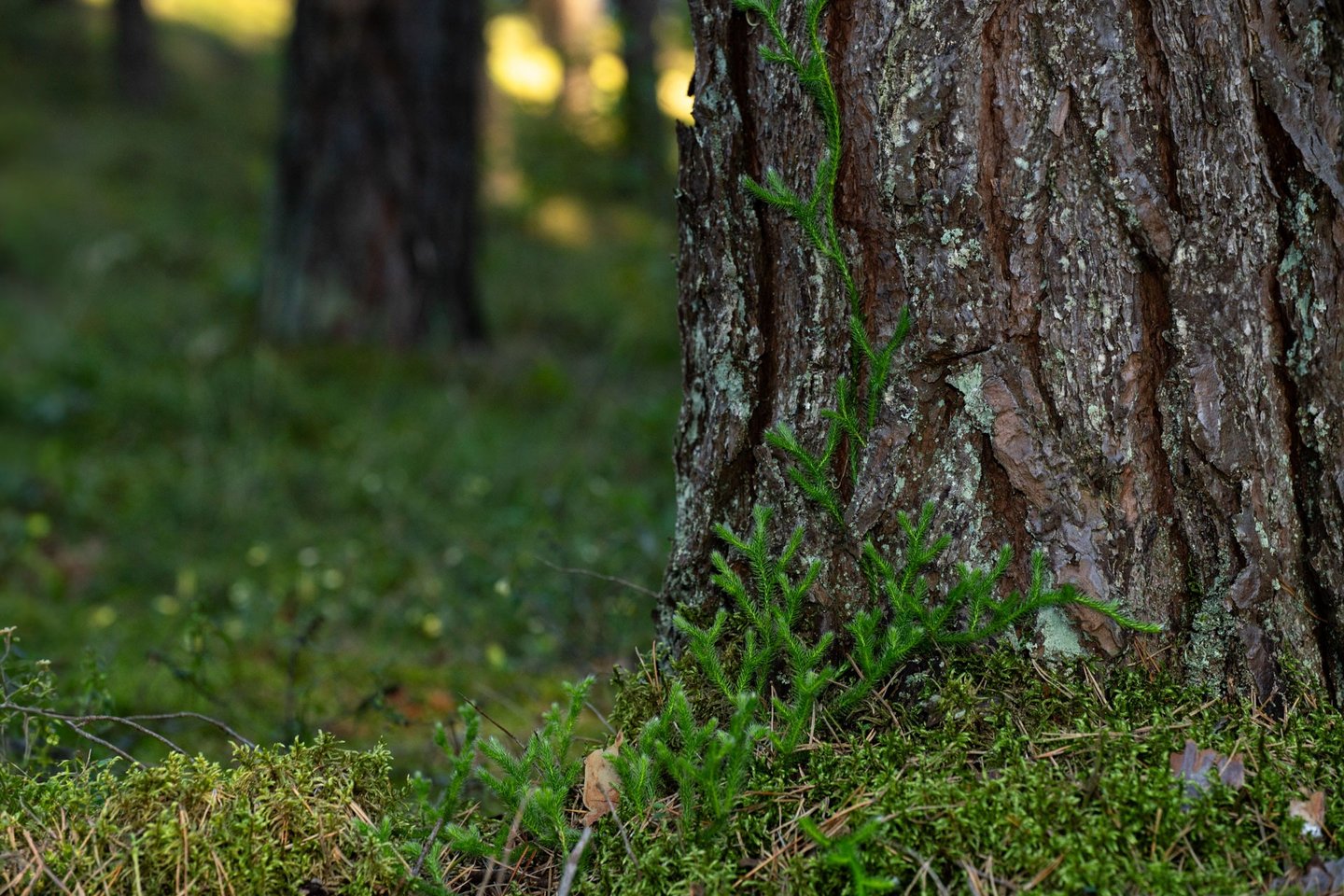 Approximately 350 million years ago, lycopod ancestors stood as colossal, 30 m high trees. When they died, they fell into swamps and got buried by mud and dirt. Over a long time, the heat and pressure from the Earth turned these old lycopods into coal we use today | Running clubmoss | Lycopodium clavatum. [Picture on the right source unknown].